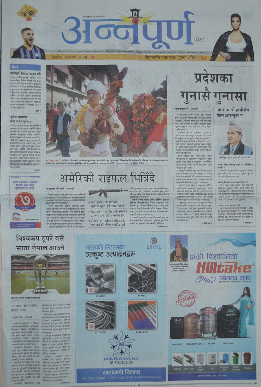 अन्नपूर्णले अन्तर प्रदेश परिषद् बैठक बस्न नसक्दा प्रदेश र संघबीच विवाद बढ्दै गएकोलाई मुख्य समाचार बनाएको छ । नेपाली सेनाले अमेरिकी राइफल एम–१६ हतियार ५ हजार थान भित्र्याउन लागेकोलाई पनि अन्नपूर्णले प्राथमिकताका साथ पहिलो पृष्ठमा कभरेज गरेको छ । समाचार अनुसार एक थान राइफलको मूल्य २ लाख रुपैयाँ छ ।