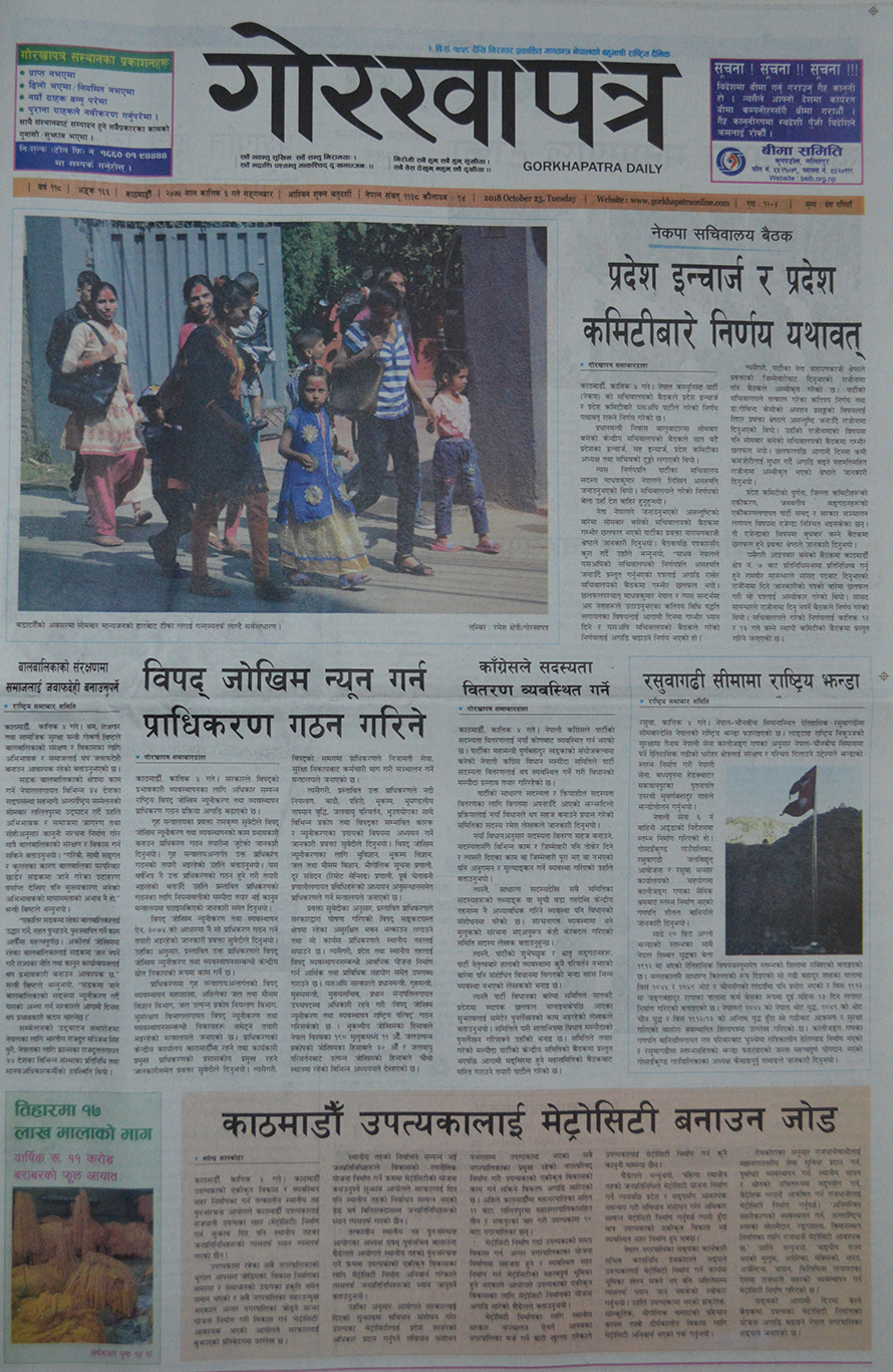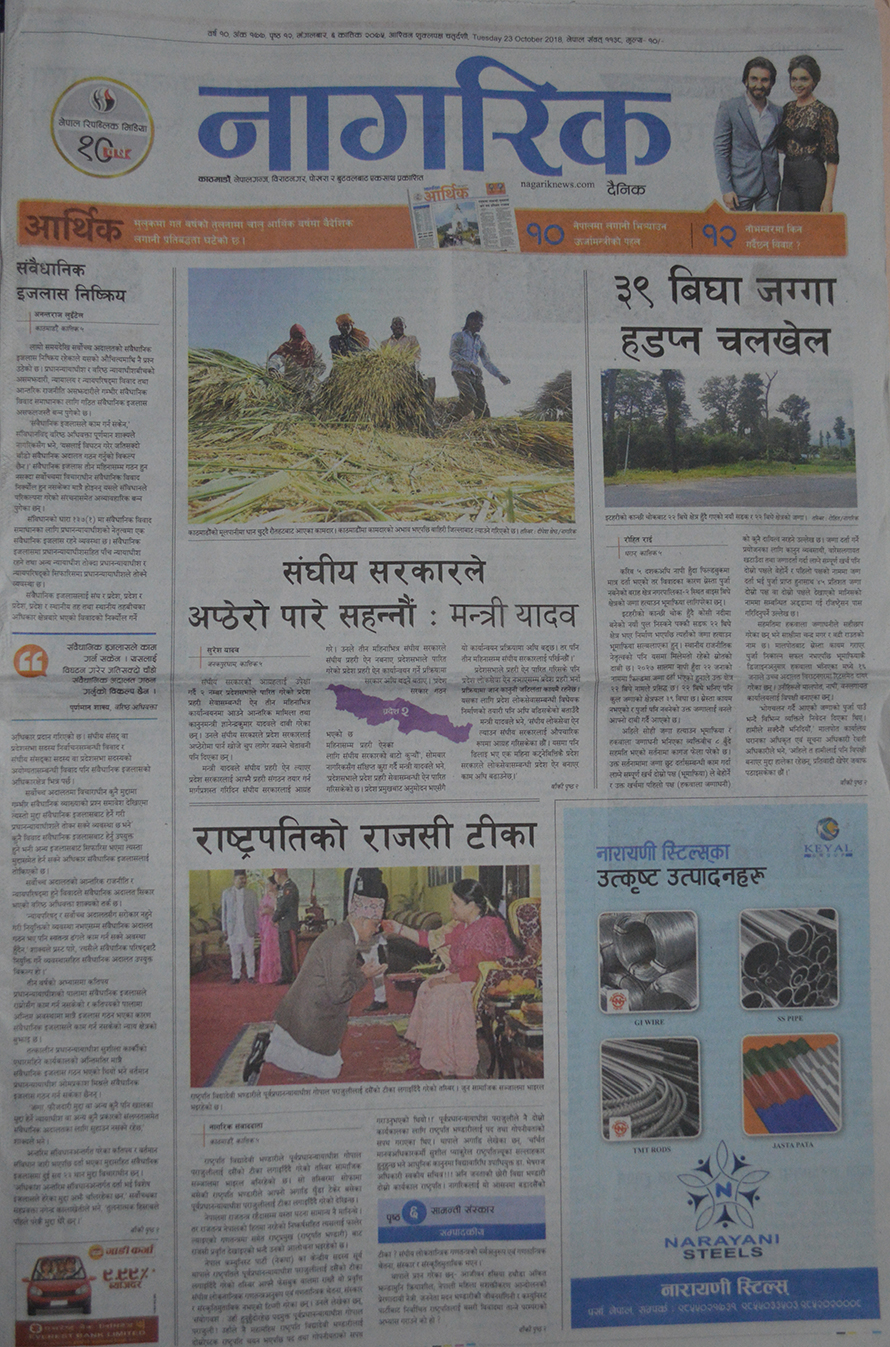 नयाँ पत्रिकामै भूकम्पले भत्काएका ४ हजार विद्यालयको पुनर्निर्माण सम्पन्न भएको, आजदेखि निजी कम्पनीले पनि स्मार्ट लाइसेन्स छाप्ने भएकोलगायत खबर छन् ।