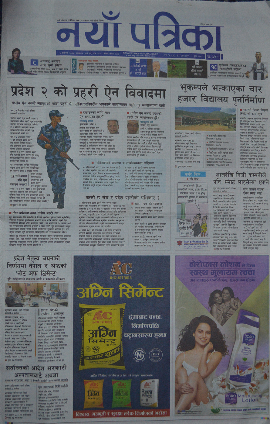 नयाँ पत्रिका दैनिकले प्रदेश २ को प्रहरी ऐन विवादमा परेकोलाई मुख्य समाचार बनाएको छ । प्रदेश २ ले गत २७ असोजमा प्रदेश प्रहरी ऐन पारित गरेको थियो । ऐन आएपछि प्रदेश सरकार प्रहरी भर्नामा जुटेको छ । तर संघीय प्रहरी ऐन नआउँदै प्रदेश प्रहरी ऐन बन्नु संविधानविपरीत रहेको संघीय सरकारको भनाइ छ ।