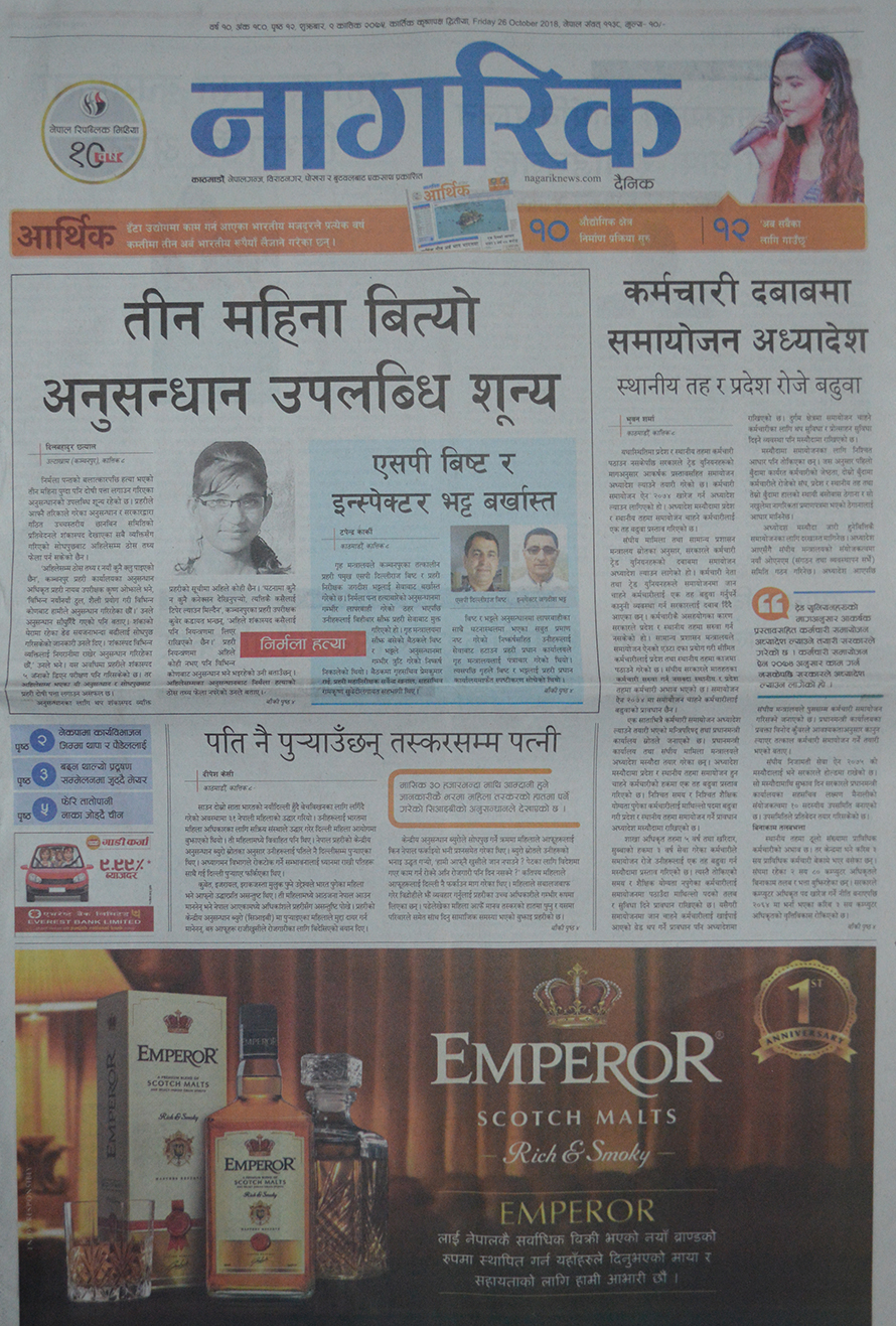 एसपी विष्ट र इन्स्पेक्टर भट्ट बर्खास्तको समाचार लेखेको नागरिकले निर्मलाको हत्या भएको ३ महिना गुज्रिसक्दासमेत अनुसन्धान उपलब्धि शून्य भएको निष्कर्ष निकालेको छ । नागरिक लेख्छ– प्रहरीले आफ्नै तरिकाले गरेका अनुसन्धान र सरकारद्वारा गठित उच्चस्तरीय छानबिन समितिको प्रतिवेदनले शंकास्पद देखाएका सबै व्यक्तिसँग गरिएको सोधपुछबाट अहिलेसम्म ठोस तथ्य फेला पर्न सकेको छैन ।