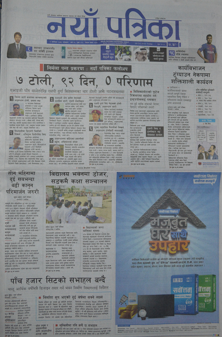 नयाँ पत्रिकाले फरक ढंगले निर्मला पन्त बलात्कार तथा हत्या प्रकरणको छानबिनमा भइरहेका प्रगतिबारे उधिनेको छ । घटनाबारे छानबिन गर्न ७ टोली गठन भए पनि ९२ दिनमा परिणाम भने शून्य रहेको नयाँ पत्रिकाको ठम्याइ छ ।
