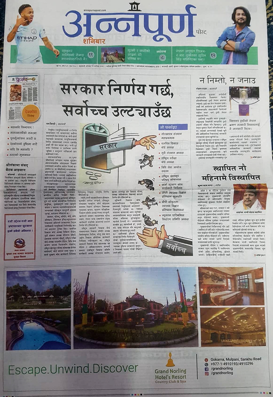 अन्नपूर्ण पोष्ट दैनिकले नियुक्ति र पदमुक्तिसम्बन्धी ५७ निर्णय कार्यान्वयन गर्न सर्वोच्च अदालतले सरकारलाई रोक लगाएको विषयलाई मुख्य समाचार बनाएर छापेको छ ।
