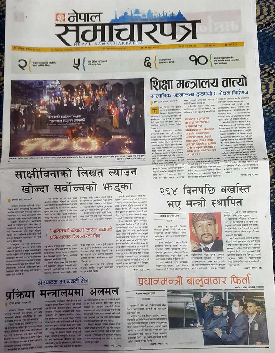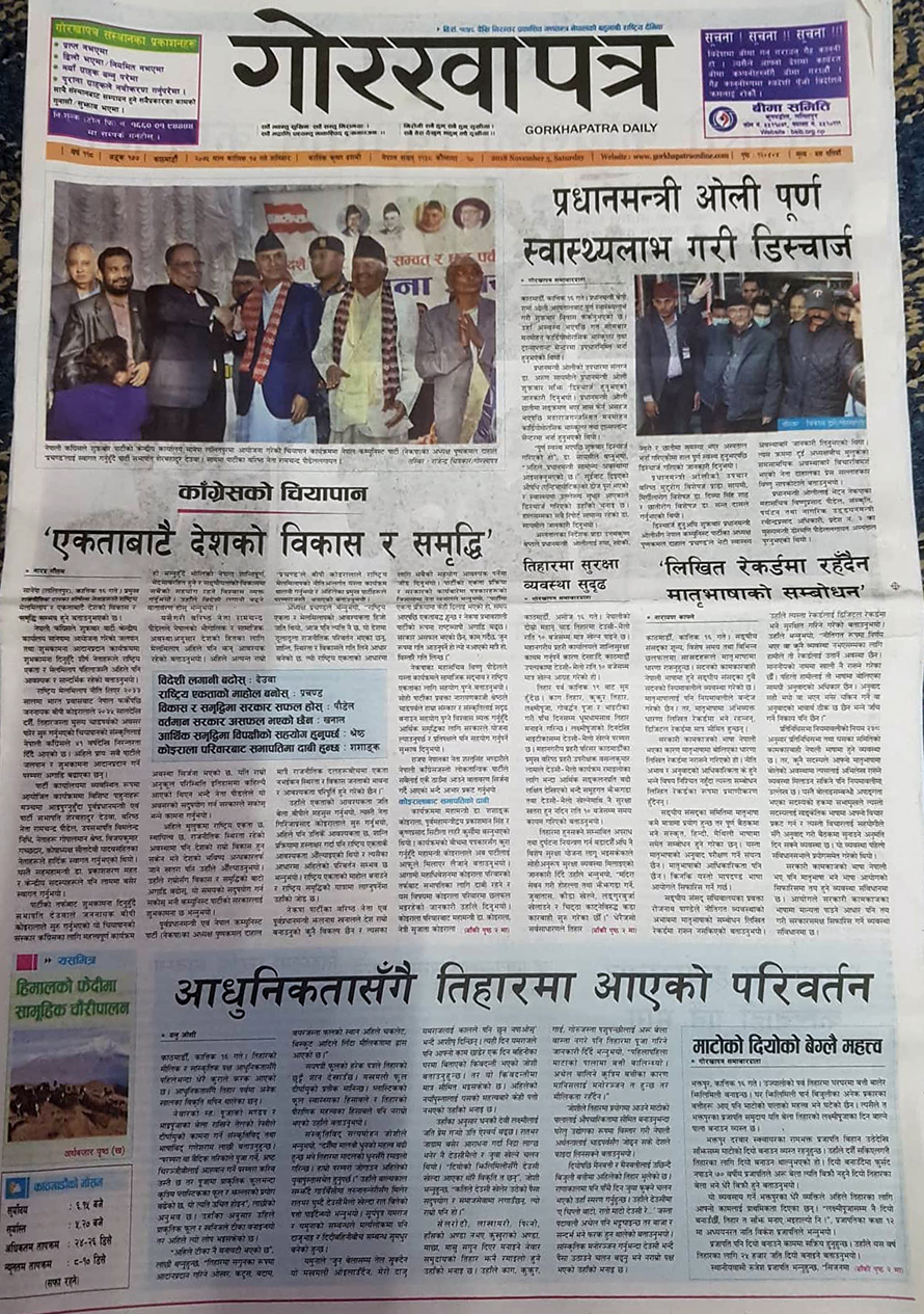 यसैगरी गोरखापत्र दैनिकमा प्रधानमन्त्री ओली पूर्णस्वास्थ्यलाभ गरी डिस्चार्ज भएको विषय मुख्य समाचारको रुपमा छ । गोरखापत्रमै संघीय संसदका शून्य, विशेष समय तथा बिभिन्न छलफलमा सांसदहरुले मातृभाषामा राखेको धारणा लिखित रेकर्डमै नरहने गरेको समाचार छ ।