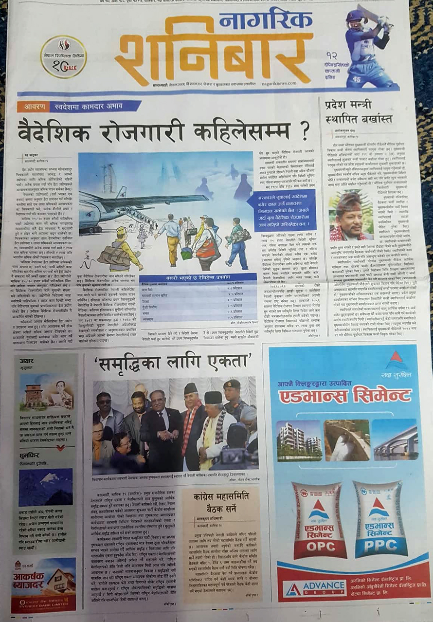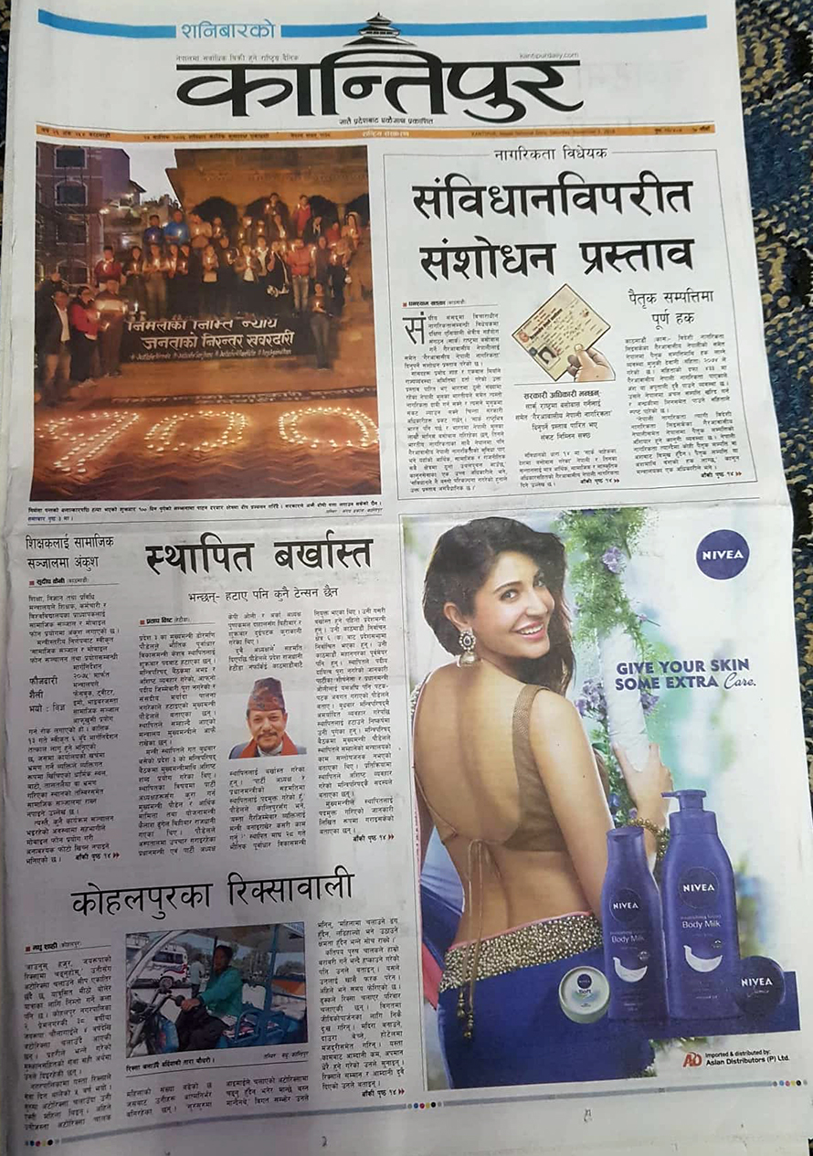 कान्तिपुर दैनिकले संविधानविपरीत नागरिकता विधेयकमा संशोधन प्रस्ताव ल्याइएको विषयलाई मुख्य समाचार बनाएर छापेको छ । संघीय संसदमा विचाराधीन नागरिकतासम्बन्धी विधेयकमा दक्षिण एसियाली क्षेत्रीय सहयोग संगठन (सार्क) राष्ट्रमा बसोबास गर्ने गैरआवासीय नेपालीलाई समेत ‘गैरआवासीय नेपाली नागरिकता’ दिनुपर्ने संशोधन प्रस्ताव परेको छ ।