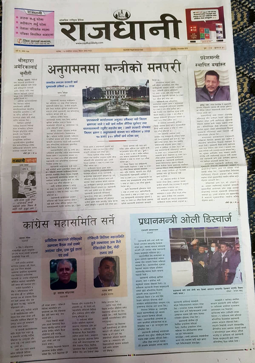 यसैगरी प्रधानमन्त्री केपी शर्मा ओलीको जिल्ला भ्रमणमा हवाई खर्च र सुरक्षाकर्मीको दैनिक भ्रमण भत्तामा ७ लाख ९१ हजार ६३२ रुपैयाँ खर्च भएको राजधानी दैनिकको समाचारमा उल्लेख छ ।