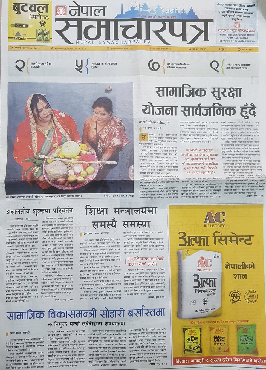 २८ कात्तिक, काठमाडौं । राजधानी काठमाडौंबाट आज प्रकाशित राष्ट्रिय दैनिक पत्रिकाहरुले सुदूरपश्चिम प्रदेशका सामाजिक विकासमन्त्री दीर्घ सोडारी बर्खास्त भएकोदेखि फेसबुकमा स्ट्याटस लेख्दा सरकारले ११ निकायलाई स्पष्टीकरण बुझाउन लगाएकोसम्मका खबर लेखेका छन् ।