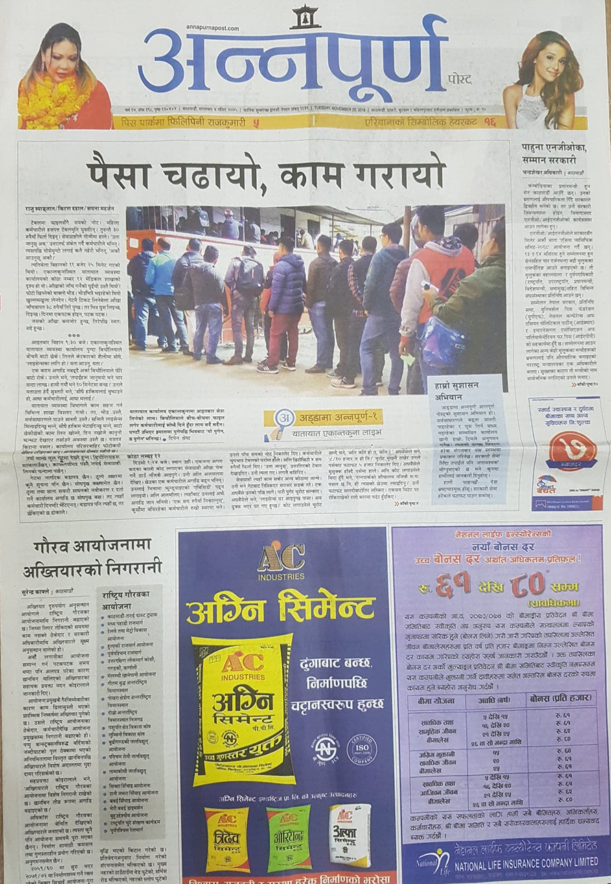 यातायात व्यवस्था कार्यालय एकान्तकुनाको बेथितिबारे मुख्य समाचार लेखेको अन्नपूर्णले राष्ट्रिय गौरवका आयोजनामा अख्तियार दुरुपयोग अनुसन्धान आयोगले निगारनी बढाएको लेखेको छ । जिम्मा लिएर तोकिएको समयमा काम नसक्ने ठेकेदार र सरकारी अधिकारीमाथि अख्तियारले सुक्ष्म अनुसन्धान थालेको छ ।