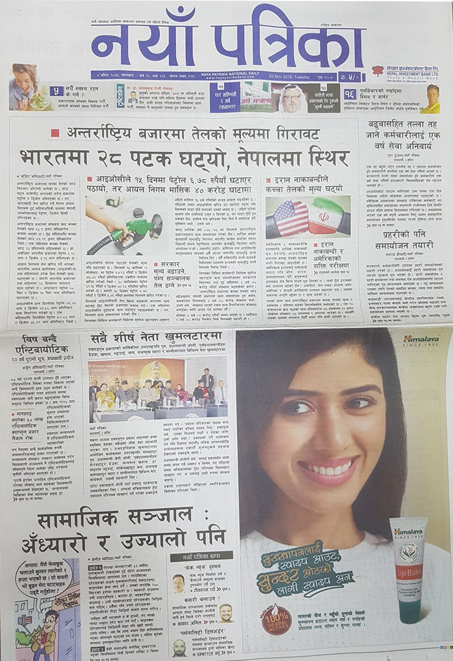 अन्तर्राट्रिय बजारमा तेलको मूल्यमा आएको गिरावटबारे नयाँ पत्रिकाले मुख्य समाचार लेखेको छ । मूल्य गिरावटपछि भारतले २८ पटक मूल्य घटाए पनि नेपालमा भने मूल्य स्थिर रहेको समाचारको सार छ । आईओसीले १५ दिनमा पेट्रोल ६.७८ रुपैयाँ घटाएर पठाए पनि आयल निगम मासिक ४० करोड घाटामा रहेको छ ।