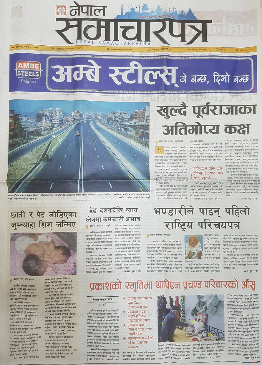 पहिलो पृष्ठमै जथाभावी सडक विस्तारले फेवाताल संकटमा परेको, बंगलादेश र म्यान्मारको चेपमा नेपाल परेको, पूर्वराजाका अतिगोप्य कक्ष खोल्ने तयारी गरिएकोलगायत खबर छन् ।