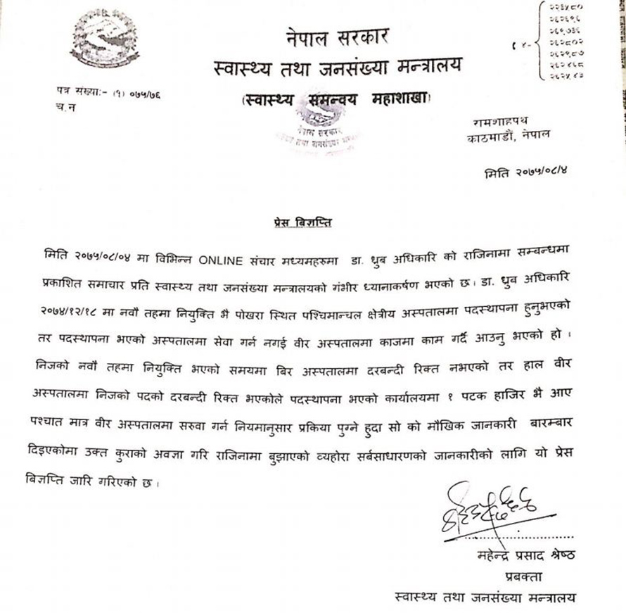 ‘डा. ध्रुव अधिकारी ०७४ चैत १८ मा नवौं तहमा नियुक्त भई पोखरास्थित पश्चिमाञ्चल क्षेत्रीय अस्पतालमा पदस्थापन भएकोमा त्यहाँ नगई वीर अस्पतालमा काजमा काम गर्दै आउनु भएको हो’, स्वास्थ्य तथा जनसंख्या मन्त्रालयका प्रवक्ता महेन्द्रप्रसाद श्रेष्ठद्वारा मंगलबार जारी विज्ञप्तिमा भनिएको छ ।