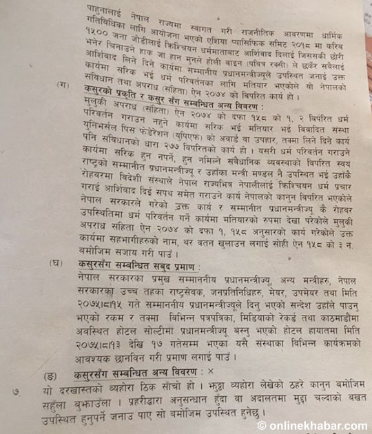 उनले जाहेरीमा भनेका छन्, ‘लोकतन्त्र र सुशासनको नेतृत्व गरेको भन्दै पुरस्कार र तक्मा दिने, अन्तर्राष्ट्रिय क्षेत्रमा शान्ति कायमका लागि कार्यक्रम गर्ने गराउने भन्दै आयोजक बनेर प्रधानमन्त्रीको उपस्थितिमा ५ दिनसम्म होटल हायालमा क्रिष्चिय सम्मेलन गरेर जनतालाई क्रिष्चियन धर्मप्रति आकर्षित एवं आस्था राख्न बाध्य पार्ने तरिकाले नेपालका उच्च पदाधिकारी, उच्च ओहोदाका कर्मचारी राष्ट्रसेवक एवं मेयर, उपमेयरलाई सम्मेलनमा बोलाएर सच्चा माता भनिने मुनबाट आर्शिवाद समेत लिने काम भएको छ ।’