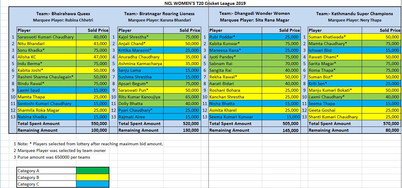 हरेक टिमले अधिकतम ६ लाख ५० हजार रुपैयाँ खर्च गर्न पाउने सीमा तोकिएको थियो । जसमा ए श्रेणीमा २१ जना, बी श्रेणीमा २५ जना र सी श्रेणीमा ३५ जना रहेका थिए ।