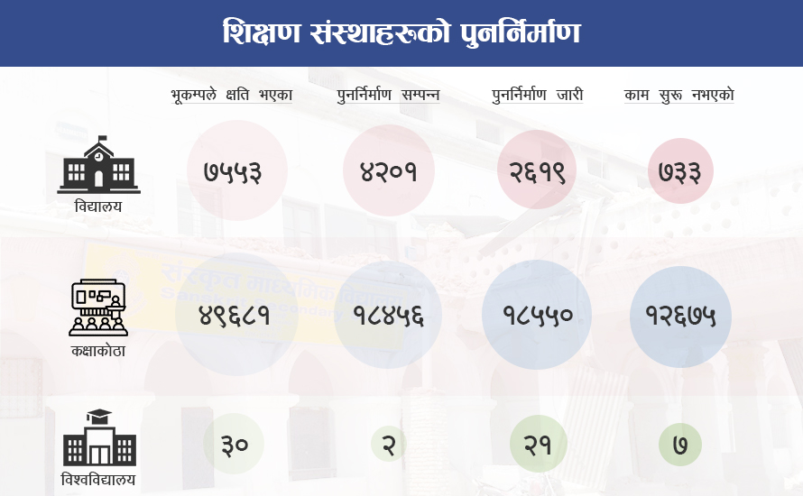 जिल्लाकै पुरानो विद्यालय भवन जमिनमा थुप्रिएपछि एकमहिना पठनपाठन बन्द भयो । शिशुदेखि १२ कक्षासम्म पढ्ने विद्यार्थीको लागि एक महिनामा पढ्ने ठाउँ तयार गर्ने अवस्था भएन ।