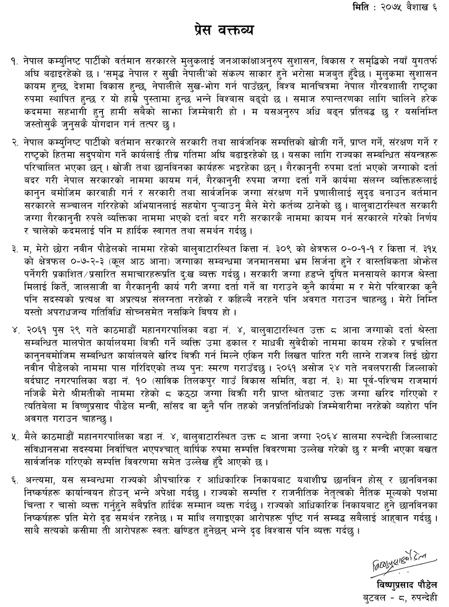 ‘सरकारी जग्गा हडप्ने दुषित मनसायले काजग श्रेष्ता मिलाई किर्ते, जालसाजी वा गैर कानूनी कार्य गरी जग्गा दर्ता गर्ने वा गराउने कुनै कार्यमा म र मेरो परिवारका कुनै सदस्यको प्रत्यक्ष वा अप्रत्यक्ष संलग्नता नरहेको र कहिल्यै नरहने पनि अवगत गराउन चाहन्छु । मेरो निम्ति यस्तो अपराधजन्य गतिविधि सोच्नसमेत नसकिने विषय हो ।’