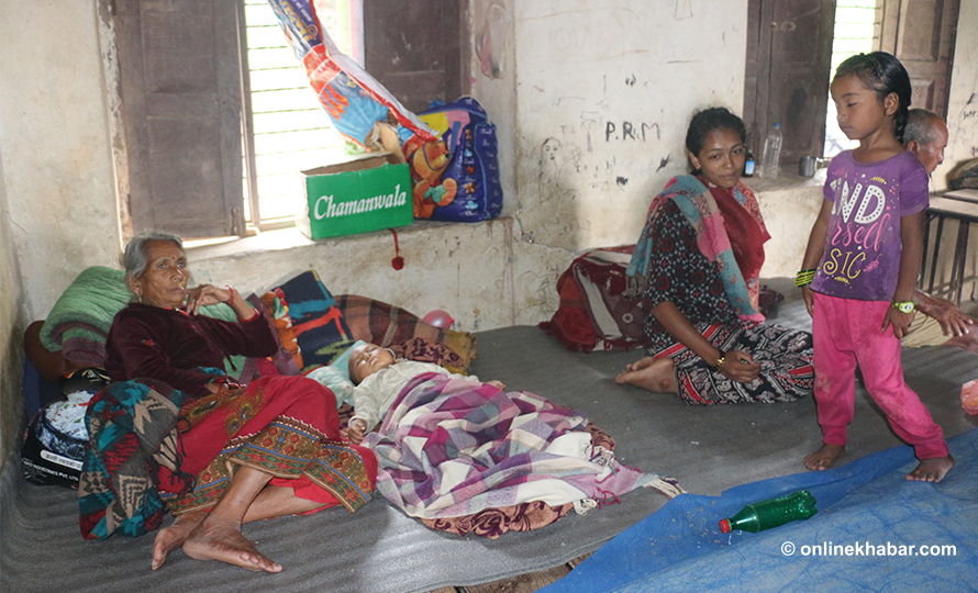 वडा नम्बर ३ को घारडाँडामा रहेको लालन रानाको घरमा ६२ जना बसिरहेका छन् । अरु भन्दा यो घर केही सुरक्षित भएकाले उनीहरु यहीँ बसेका हुन् । ‘गोठ र करौसामा पहिरो खसेको छ,’ स्थानीय ३३ बर्षीय सुमन रानाले भने ।