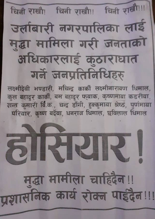 मेयर–उपमेयरबीचको विवाद चर्कंदै गएपछि नेपाली कांग्रेसका कार्यकर्ताहरु अदालतमा उजुरी गर्ने १३ जनाविरुद्ध पर्चा पम्प्लेट टाँस्दै हिँड्न थालेका छन् । नगरपालिकाको काम रोकिनुमा अदालतमा मुद्दा हाल्ने उपमेयर र नेकपाका १३ जनप्रतिनिधिहरु दोषी रहेको कांग्रेसको आरोप छ ।