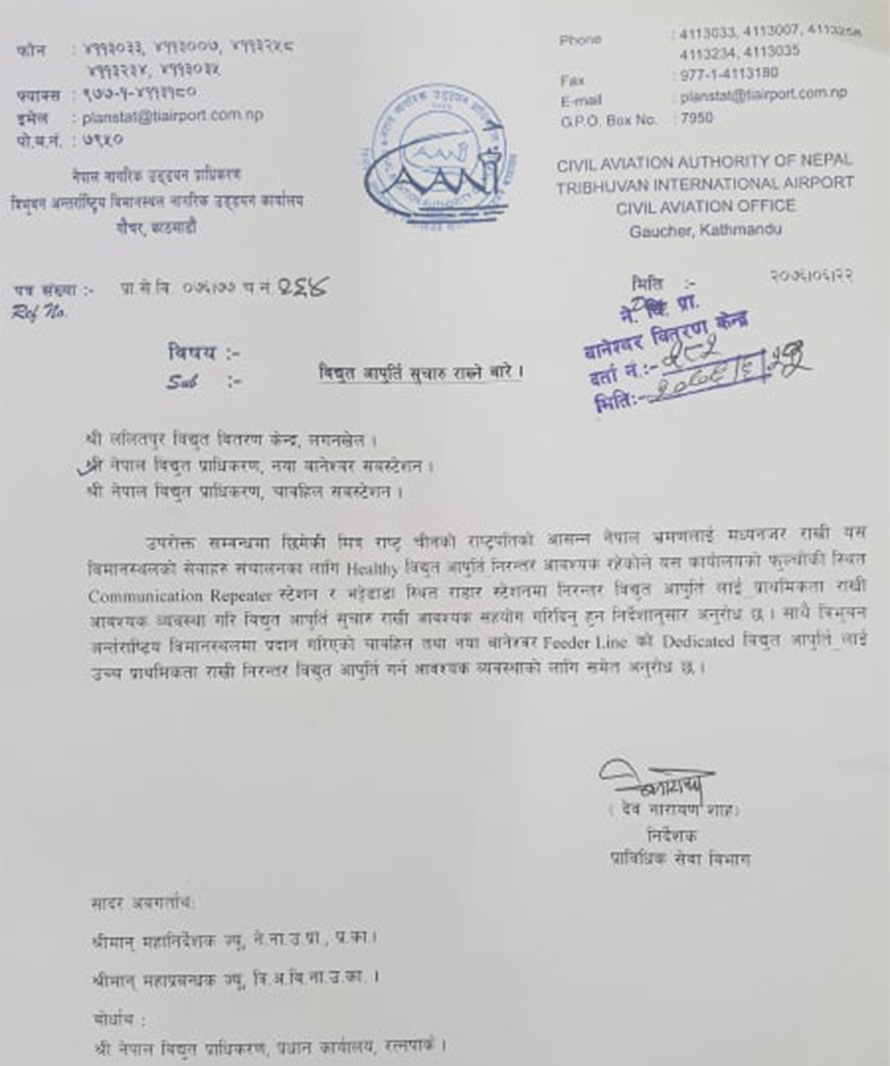 उड्ययन प्राधिरकणले एक पत्र लेख्दै त्रिभुवन अन्तर्राष्ट्रिय विमानस्थल, ललितपुरको भट्टेडाँडास्थित रडार स्टेशन र फूलचौकी स्थित कम्युनिकेसन रिपिटर स्टेसनमा विजुली नजाने व्यवस्था गर्न विद्युत प्राधिकरणलाई भनेको हो । यी टावरहरु हवाई उडानको सुरक्षाका हिसावले निकै महत्वपूर्ण र संवेदननशील छन् ।
