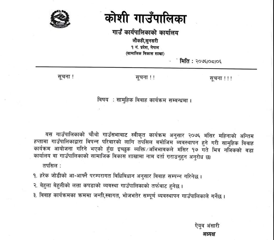 विपन्न परिवारको यही बाध्यतालाई सुनसरीको कोशी गाउँपालिकाले सम्बोधन गर्ने भएको छ । गाउँपालिकाले विपन्न परिवारका छोरा–छोरीको निःशुल्क सामूहिक विवाह गरिदिएर विपन्न परिवारलाई सहायता गर्न लागेको हो ।