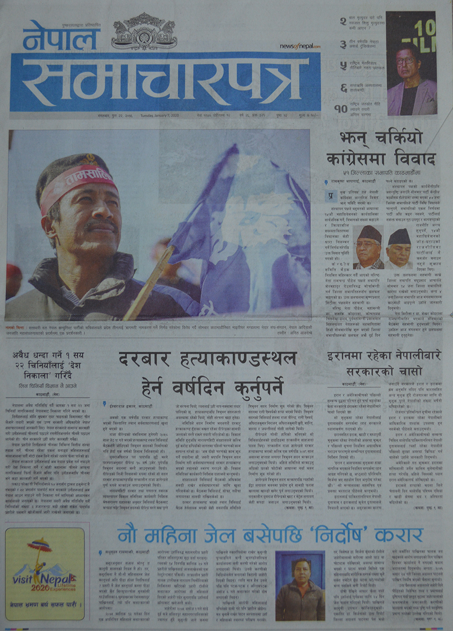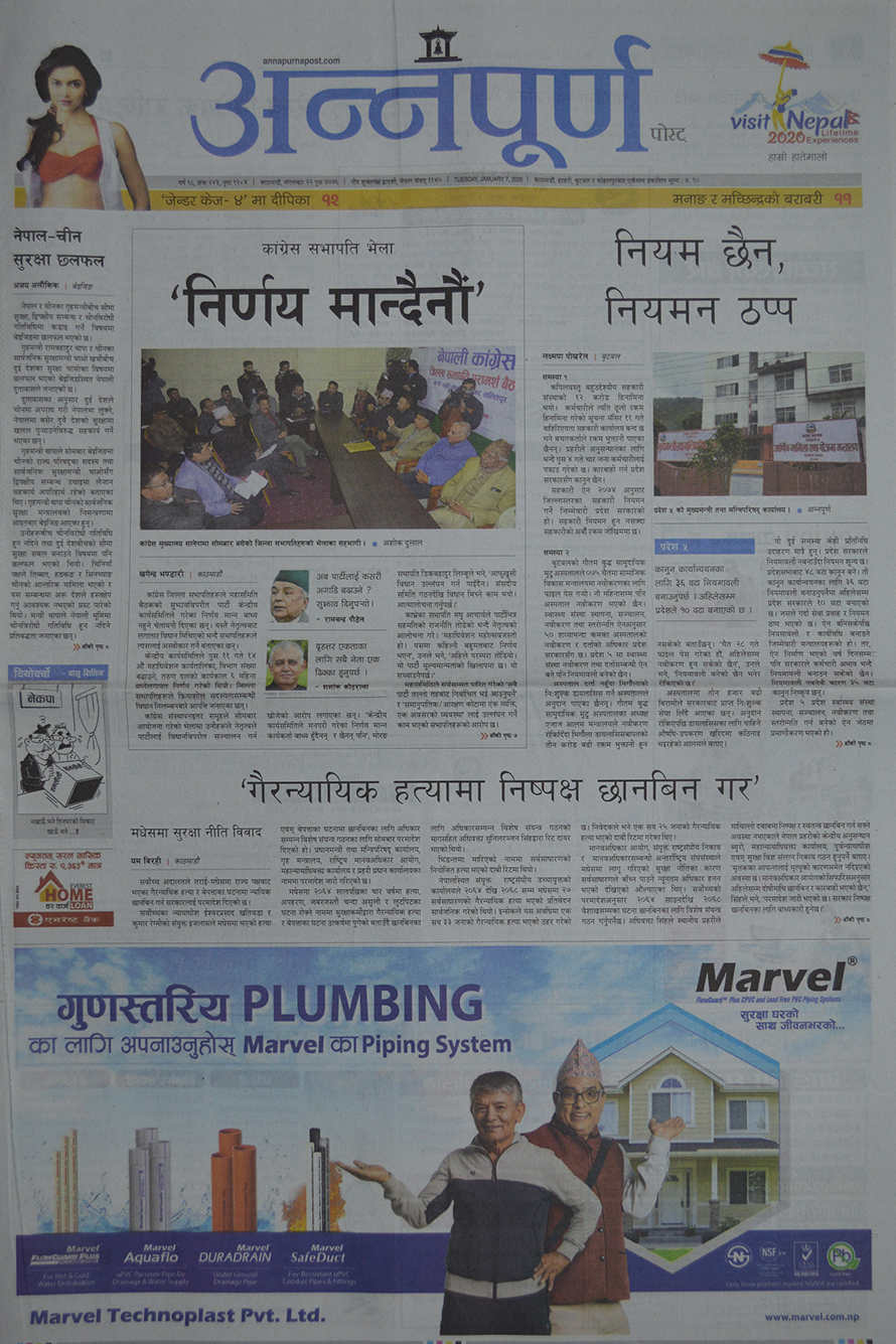 कांग्रेस जिल्ला सभापतिले नेतृत्वलाई दिएको चेतावनी र तराई मधेसकामे गैरन्यायिक हत्यामा निष्पक्ष छानबिन गर्न सर्वोच्च अदालतले सरकारलाई दिएको परमादेशलाई पनि अन्नपूर्णले पहिलो पृष्ठमा समेटेको छ ।