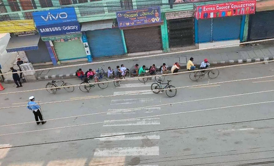 १२ चैत, बुटवल । लकडाउनको उल्लंघन गर्दै साइकल चलाएको भन्दै प्रहरीले १२ जनालाई ‘मुर्गा’ बनाएर सजाय दिएको छ ।