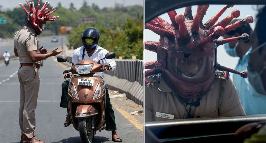 भारतमा एकजना प्रहरी अधिकारी कोरोना भाइरस जस्तै आकृतिको हेलमेट लगाएर सडकमा ड्युटीमा निस्किन थालेका छन् ।