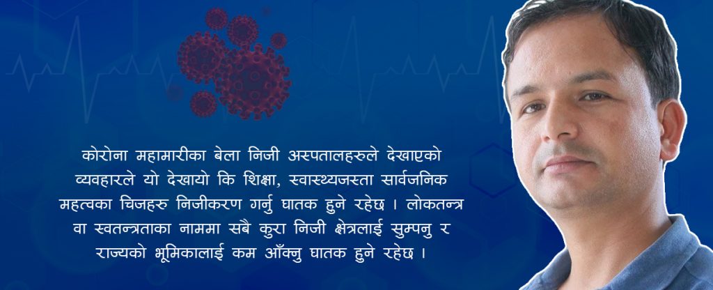 कोरोना महामारीका बेला निजी अस्पतालहरुले देखाएको व्यवहारले यो देखायो कि शिक्षा, स्वास्थ्यजस्ता सार्वजनिक महत्वका चिजहरु निजीकरण गर्नु घातक हुने रहेछ । लोकतन्त्र वा स्वतन्त्रताका नाममा सबै कुरा निजी क्षेत्रलाई सुम्पनु र राज्यको भुमिकालाई कम आँक्नु घातक हुने रहेछ ।
