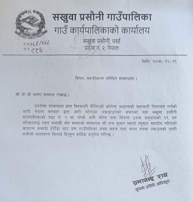 गाउँपालिका कार्यालयका सूचना प्रविधि अधिकृत प्रमानन्द रायले हस्ताक्षर गरेको पत्रमा समेत लकडाउनका कारण बडानम्बर १ मा रहेका विपन्न उराव समुदायका १९ घर परिवारलाई भोर संस्थाले दिन लागेको खाद्यान्न सामग्री गाउँपालिकासम्म सहज तथा सरल रुपमा ल्याउन सहजीकरण गर्न आग्रह गरिएको छ ।