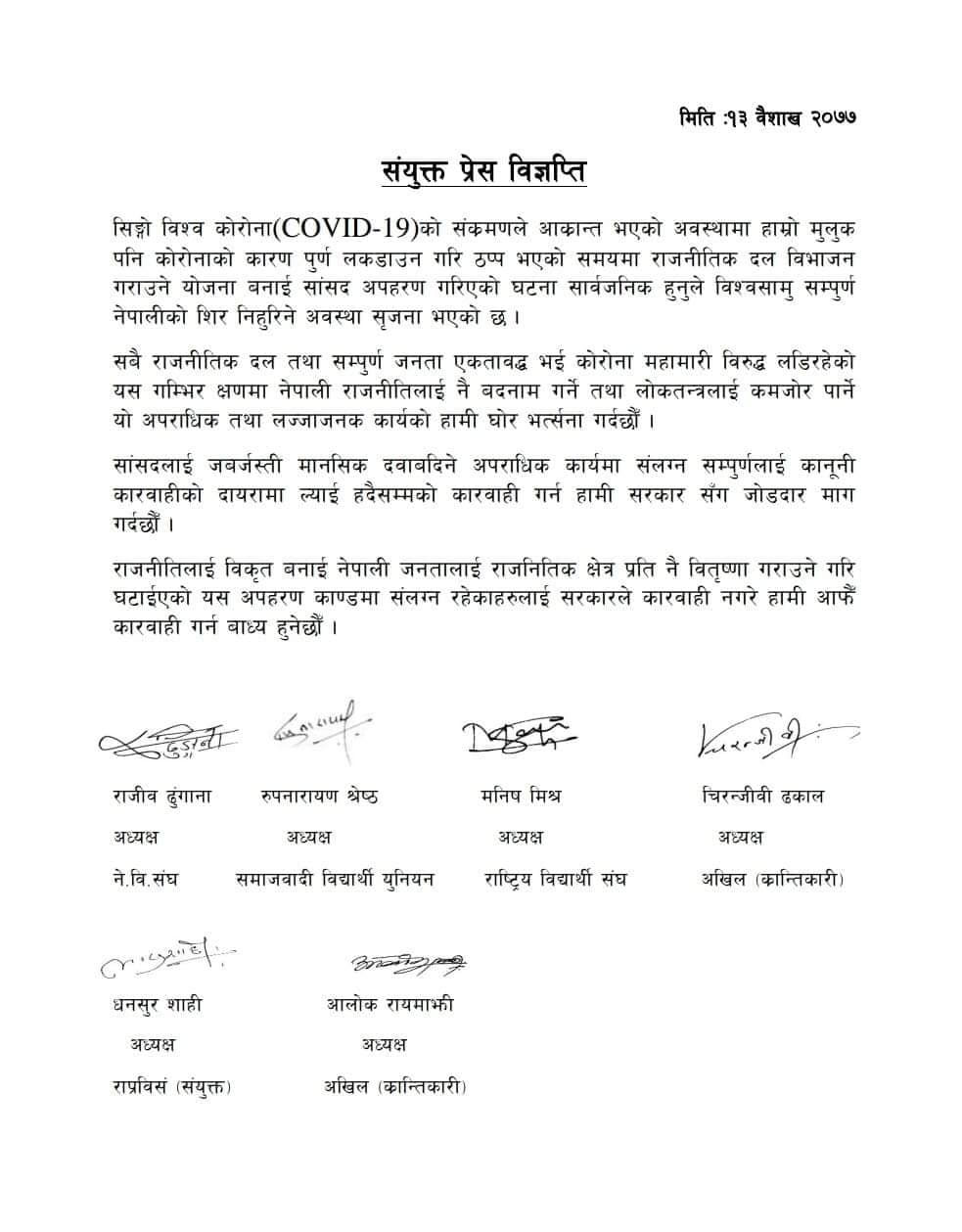 कोरानाले मुलुक आक्रान्त भइरहेको बेला लकडाउनको मौका छोपी सांसदलाई नै ‘अपहरण’ गरिनु अपराधिक कार्य भएको भन्दै विद्यार्थी संगठनहरूले घटनाको छानबिन गर्न माग गरेका हुन् ।