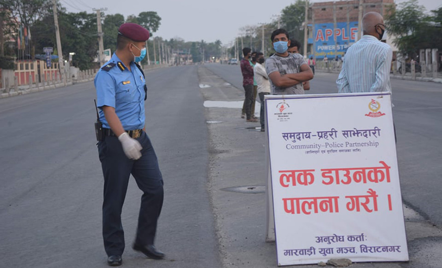 १४ वैशाख, विराटनगर । कोरोना भाइरसको सम्भावित जोखिम नियन्त्रणका लागि सरकारले लकडाउन आह्वान गरेको एक महिना पूरा भएको छ । लकडाउनमा सर्वसाधारणलाई घरमै राख्नका लागि चोकचोकमा प्रहरी परिचासलित छन् ।