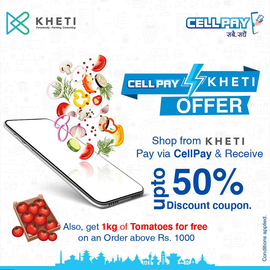 यो अफरअन्तर्गत ग्राहकहरुले खेती एप वा वेब एप्लिकेसनबाट कुनै पनि सामान खरिद गरी सेल-पेबाट भुक्तानी गरे ५० प्रतिशतसम्मको डिस्काउन्ट कुपनका साथै रु. १००० भन्दामाथि रकमको सामानको खरिदमा १ किलो टमाटर सित्तैमा पाउनेछन् ।