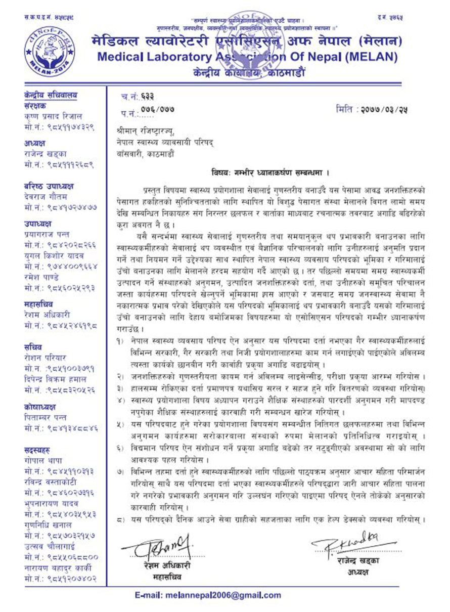 परिषद्मा दर्ता नभएका स्वास्थ्यकर्मीहरुलाई विभिन्न सरकारी, गैर सरकारी तथा निजी प्रयोगशालाहरुमा काममा लगाइएको पाइएको भन्दै मेलानले आवश्यक छानविन गरी कारबाही गर्न माग समेत गरेको छ ।