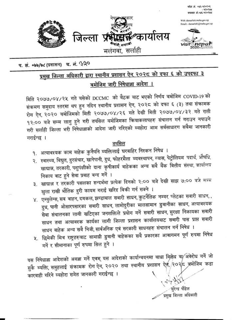 २५ साउन, काठमाडौं । जिल्ला प्रशासन कार्यालय सर्लाहीले सोमबारदेखि लागु हुने निषेधाज्ञा जारी गरेको छ ।