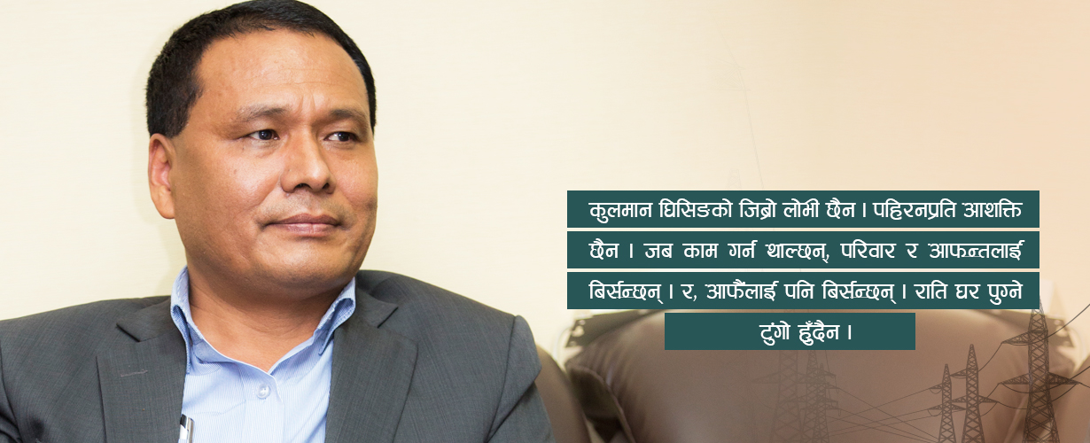 २०७३ साल । कुलमान घिसिङ नेपाल विद्युत प्राधिकरणको प्रवन्ध निर्देशक भए । तिहारको संयोग । मुलुकमा सर्वाधिक विद्युत खपत हुने दिन, लक्ष्मीपूजा । सबै पेशा÷व्यवसायी चाडपर्वको मुडमा फुर्सदिला दिन कटाउने मेलोमेसोमा लागे । तर, कुलमानको ध्याउन्न एउटै कुरमा थियो, ‘कसरी तिहारमा मुलुकभर निरन्तर विद्युत आपूर्ति गर्ने ?’