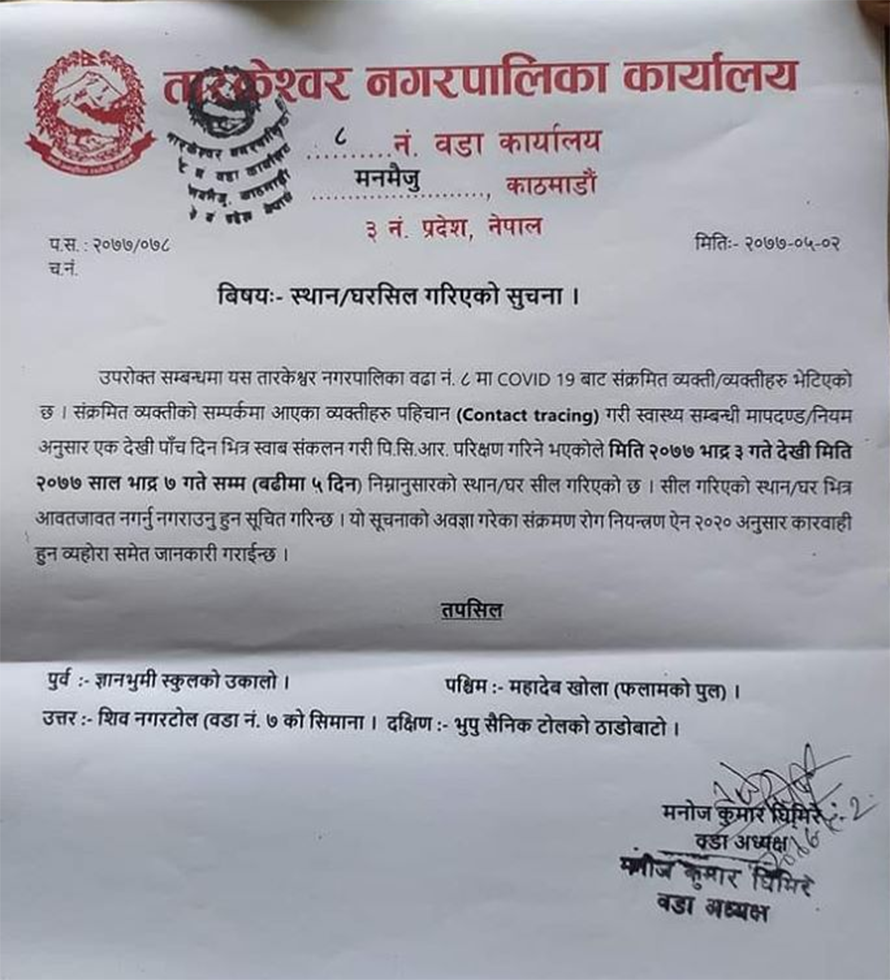 कोरोना संक्रमित भेटिएपछि तारकेश्वर नगरपालिका वडा नम्बर ८ सिल