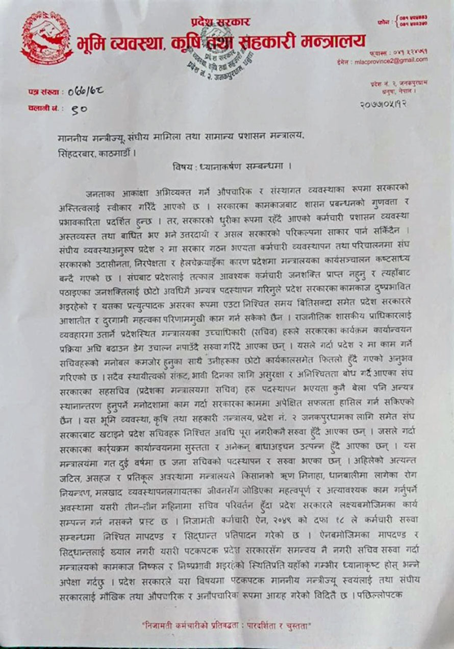 पटकपटक प्रदेश सरकारसँग समन्वय नै नगरी सचिव सरुवा गर्दा मन्त्रालयको कामकाज निष्प्रभावी भइरहेको स्थितिप्रति गम्भीर हुन पनि आग्रह गरिएको छ ।