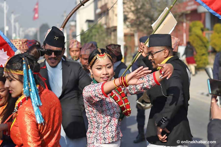 ढाका र भाद्भाउले टोपी, दौरा-सुरुवाल, गुन्यु-चोली लगाएका युवाहरुले नेपाली झण्डासहित मार्चपास गरेका हुन् ।
