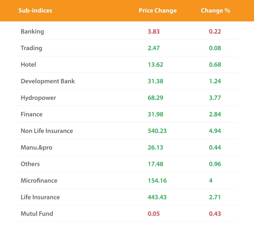 बिहीबार बैंकिङ ३.८३ र म्युचुअल फण्ड ०.०५ अंकले घटेको छ । अन्य सबै उपसमूहहरु उकालो लागेका छन् । सबैभन्दा धेरै निर्जिवन बिमा कम्पनी ४.९४ प्रतिशतले वृद्धि भएको छ ।
