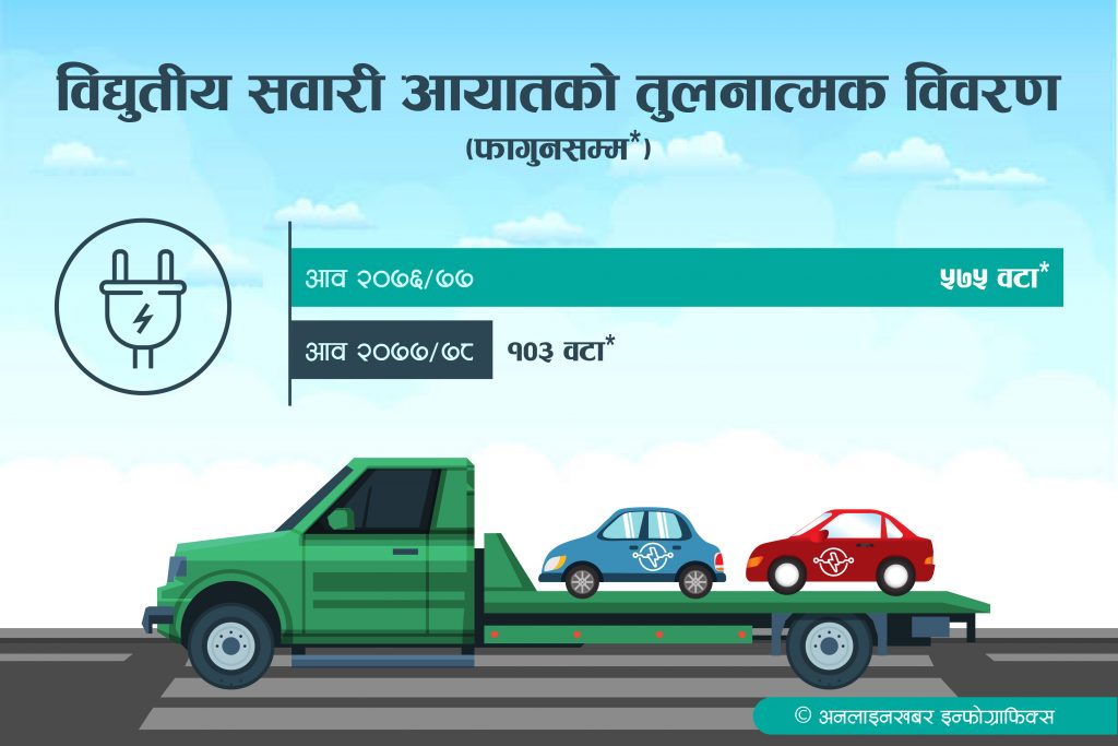 विद्युतीय सवारीमा भन्सार शुल्क, अन्तःशुल्क, सडक करको भार थोपर्दा मूल्य आकासिएको छ । यसले गर्दा बजारमा माग नै घटेको नाडा अटोमोबिल्स एसोसियसन अफ नेपालका अध्यक्ष कृष्णप्रसाद दुलाल बताउँछन् । उनका अनुसार, चालु आवको ८ महिना (फागुनसम्म)मा ५० किलोवाटसम्मका ७६ र त्यसभन्दा माथिका २७ गरी १०३ वटा मात्र चारपांग्रे विद्युतीय सवारी नेपाल भित्रिएका छन् । गत आवको यही अवधिमा ५७५ वटा विद्युतीय चारपांग्रे भित्रिएका थिए ।