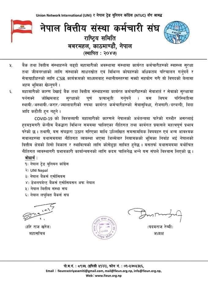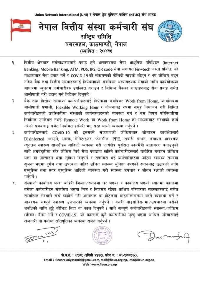 विभिन्न बैंकका शाखाहरुबाट सेवा प्रवाह समेत आलोपालो गरी प्रदान गर्न निर्देशन दिनुपर्ने भन्दै संघले बैंक तथा वित्तीय संस्थाका कर्मचारीहरुलाई निषेधाज्ञा अवधिभर वर्क फ्रम होम, कार्यालयमा आलोपालो प्रणाली साथै योजनावद्ध रुपमा समूह विभाजन गरी सिमित कर्मचारीहरुको उपस्थितीमा संस्थाको कार्यसम्पादनको व्यवस्था गर्न आग्रह गरेको छ ।
