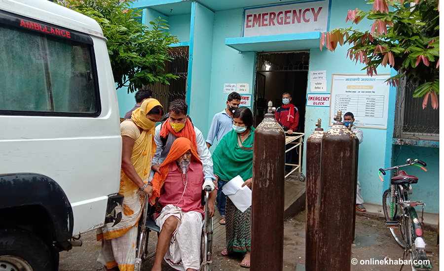 २३ वैशाख, वीरगञ्ज । नारायणी अस्पतालको एचडीयू वार्डको बेड नं ८ का बिरामीलाई अक्सिजन दिएर राखिएको छ । बिरामी कुरुवा युवाले बाहिरबाट अर्को अक्सिजन सिलिण्डर लगेर छेउमै राखेका छन् ।