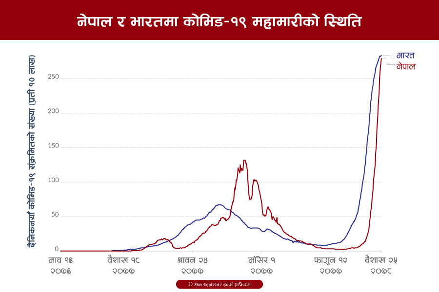 धेरै जनसंख्या र ठूलो भू-भाग भएकाले मात्र संख्यागत हिसाबमा भारतमा कोरोना संक्रमणको अवस्था भयावह देखिएको हो । तुलनात्मक रुपमा नेपालको अवस्था भारतको भन्दा कम छैन र, अवस्था अझ खराब बन्न खतरा बढ्दो छ ।