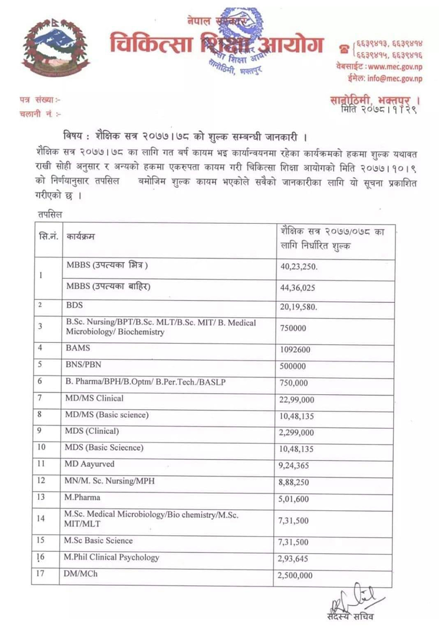 शैक्षिक सत्र २०७७/७८ का लागि नयाँ शुल्क कायम गरिएको आयोगले जनाएको छ । जसअनुसार अब एमबीबीएस अध्ययनका लागि उपत्यकाभित्र ४० लाख २३ हजार २५० रुपैयाँ निर्धारण गरिएको छ भने उपत्यकाबाहिरका लागि ४४ लाख ३६ हजार २५ रुपैयाँ तोकिएको छ ।