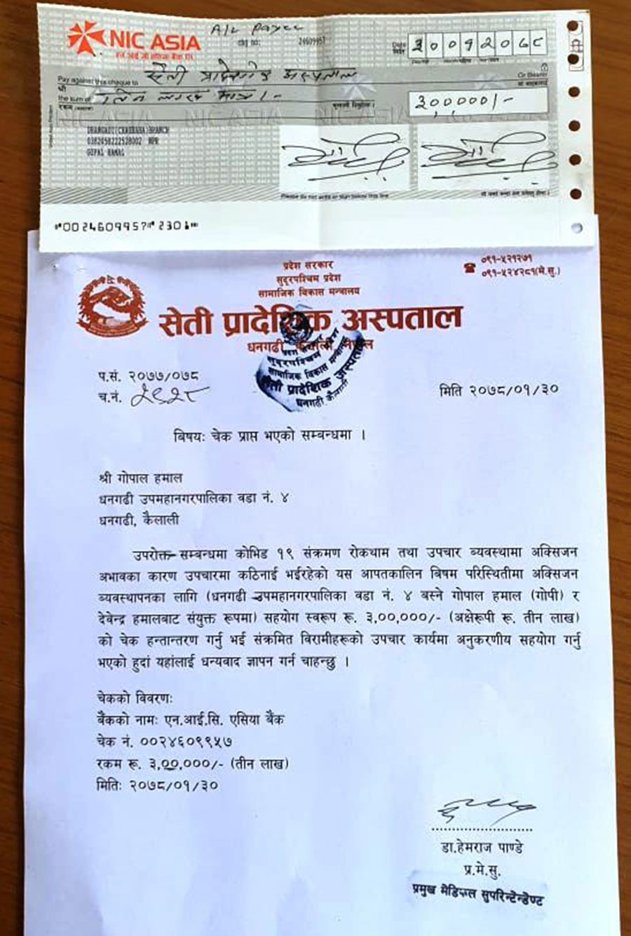 सुन्दर सुदूरपश्चिमका अभियान्ता समेत रहेका गोपाल हमालले अस्पतालमै पुगेर प्रमुख मेडिकल सुपरीटेन्डेन्ट डाक्टर हेमराज पाण्डेलाई सहयोग वापत दिइएको ३ लाख रुपैयाँको चेक हस्तान्तरण गरेका हुन् ।