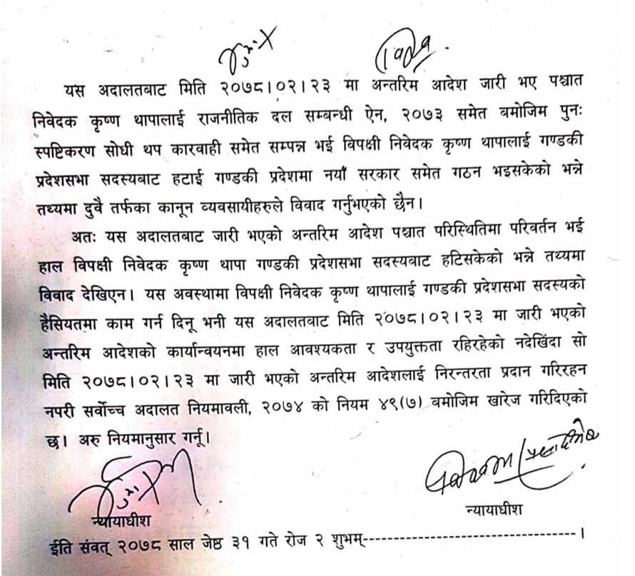 ‘यस अदालतबाट जारी भएको अन्तरिम आदेशपश्चात परिस्थितिमा परिवर्तन भई हाल विपक्षी निवेदक कृष्ण थापा गण्डकी प्रदेशसभा सदस्यबाट हटिसकेको भन्ने तथ्यमा विवाद देखिएन’ आदेशमा भनिएको छ, ‘यस अवस्थामा विपक्षी निवेदक कृष्ण थापालाई गण्डकी प्रदेशसभा सदस्यको हैसियतमा काम गर्न दिनू भनी यस अदालतबाट मिति २०७८/०२/२३ मा जारी भएको अन्तरिम आदेशको कार्यान्वयनमा हाल आवश्यकता र उपयुक्तता रहिरहेको नदेखिँदा सो … अन्तरिम आदेशलाई निरन्तरता दिन नपरी… खारेज गरिदिएको छ ।’