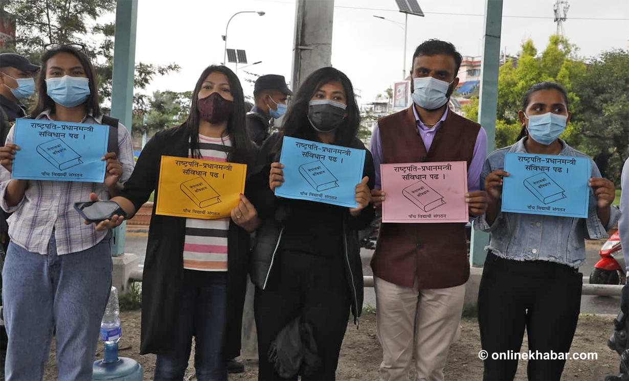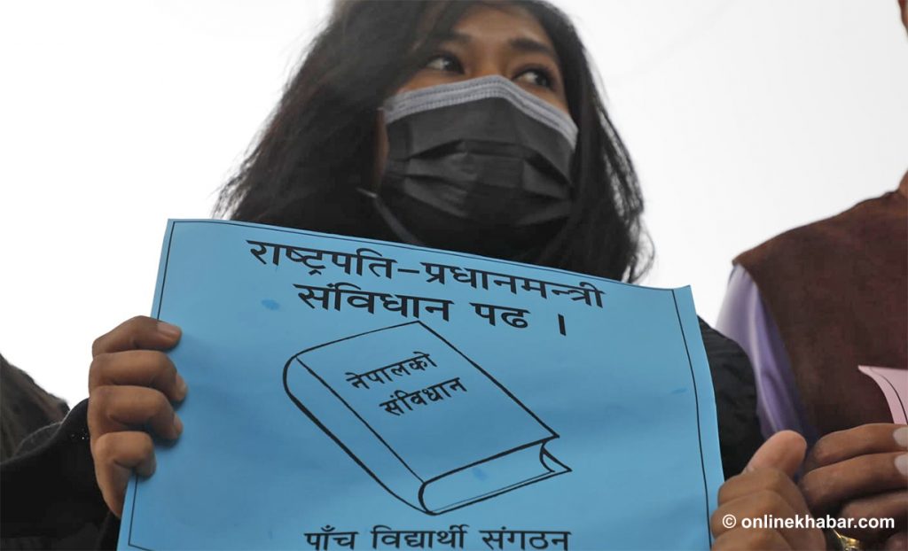 उनीहरुले राष्ट्रपति–प्रधानमन्त्री संविधान पढ लगायतका नारा लेखेको प्लेकार्ड प्रदर्शन गरेका थिए । प्रतिनिधिसभा विघटनको विरोधमा विपक्षी विद्यार्थी संगठनले विरोध गर्दै आइरहेका छन् ।