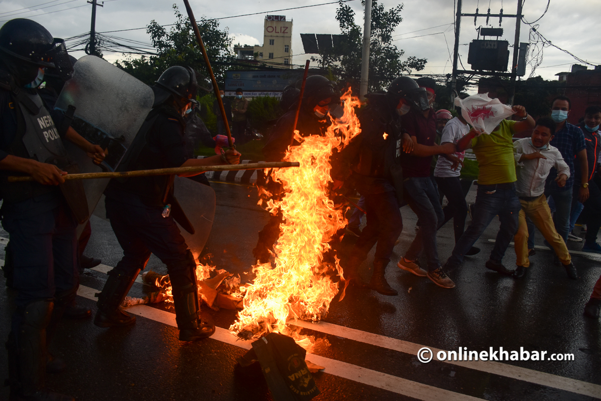 साँझ बानेश्वरमा भेला भएका कार्यकर्ताले फेरि पुत्ला जलाएका हुन् । एमाले नेता सुवास नेम्वाङले पार्टीले अदालतको फैसला मान्ने बताएका छन् । तर कार्यकर्ताले प्रदर्शन रोकेका छैनन् ।