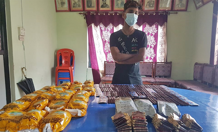 यस्तै उनले पिठ्यूँमा बोकेको झोलाभित्र चारमिनार मुम्कका (भांगको ट्याब्लेट) २४ प्याकेट, राजनिवास ३ प्याकेट र चक्कु १ थान समेत बरामद भएको उनले बताए ।