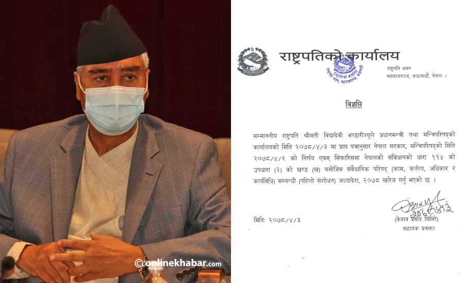 ३ साउन, काठमाडौं । संवैधानिक परिषद्सम्बन्धी विवादस्पद अध्यादेश खारेज भएको छ । प्रधानमन्त्री शेरबहादुर देउवा नेतृत्वको मन्त्रिपरिषद्को शनिबार बसेको बैठकको सिफारिसअनुसार राष्ट्रपति विद्यादेवी भण्डारीले अध्यादेश खारेज गरेकी हुन् ।