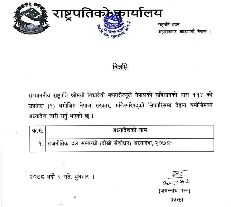 २ भदौ, काठमाडौं । राष्ट्रपति विद्यादेवी भण्डारीले राजनीतिक दलसम्बन्धी अध्यादेश प्रमाणीकरण गरेकी छन् । राष्ट्रपति भण्डारीका स्वकीय सचिव भेषराज अधिकारीले अध्यादेश प्रमाणीकरण भएको जानकारी दिए ।