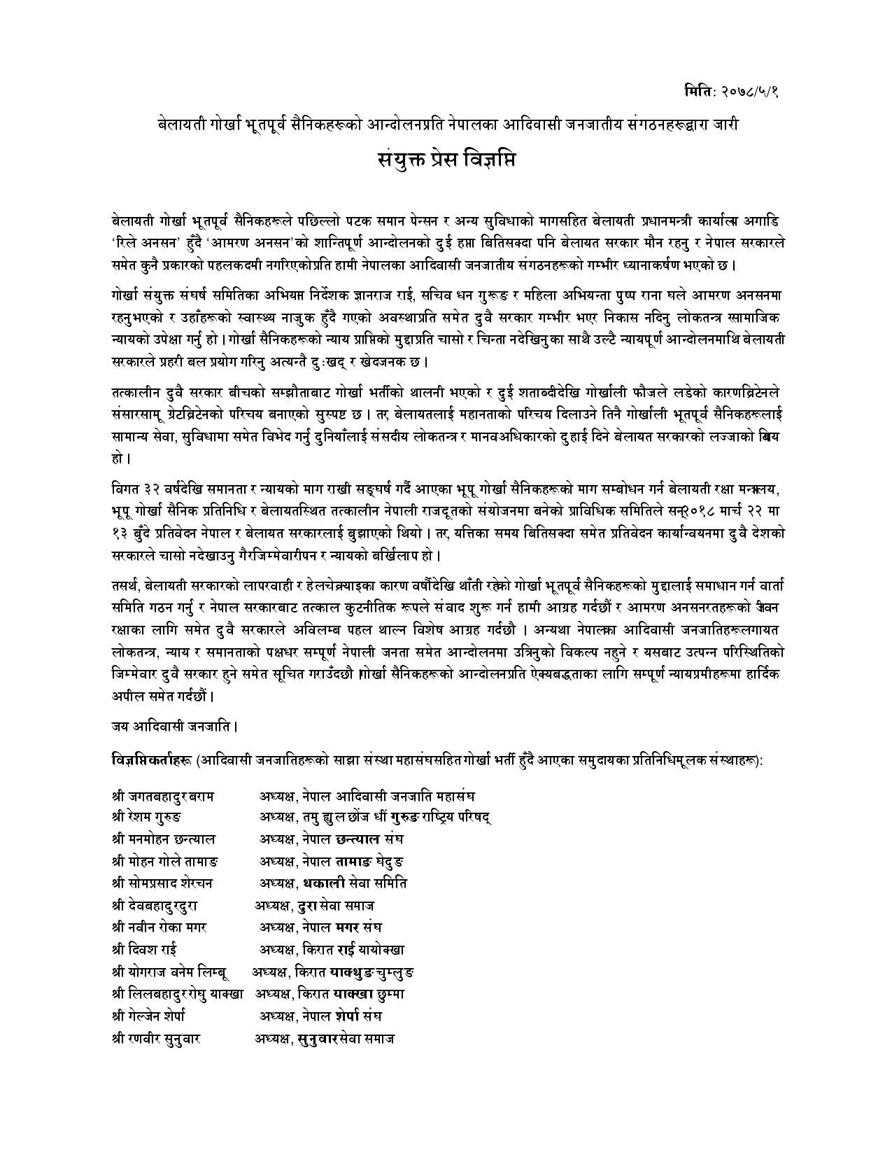 संगठनहरुले बेलायत सरकारको लापरवाही र हेलचेक्र्याइका कारण वर्षौदेखि थाँती रहेको गोरखा भूतपूर्व सैनिकहरुको मुद्दालाई समाधान गर्न नेपाल सरकारसँग कूटनैतिक रुपले संवाद गरिदिन आग्रह समेत गरेको छ । साथै सरकारले उक्त कूटनीतिक पहल नगरे आदिवासी जनजातिहरु आन्दोलनमा उत्रिने संगठनहरुले चेतावनी दिएको छ ।